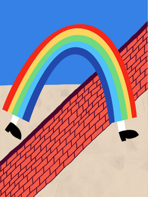 Un arcobaleno che cammina si differenzia da un semplice arcobaleno perché dotato di scarpe e calzini bianchi che gli permettono di superare svariate tipologie di ostacoli. (opera in catalogo)