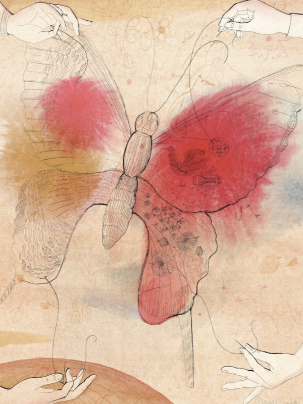 Le mani che ricamano la farfalla come metafora della forza della bellezza di stare insieme in un progetto comune. (opera in catalogo)